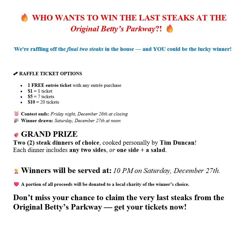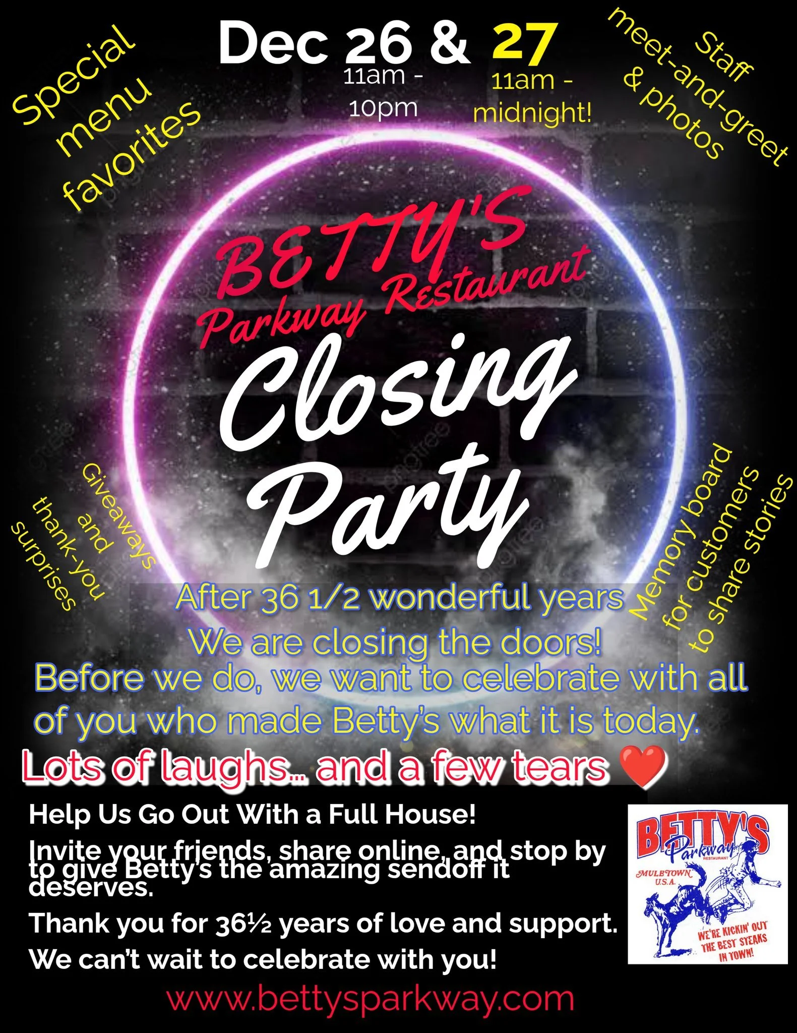 Click below to follow us on social media to keep up with what’s happening at Betty’s Parkway & learn about our specials!